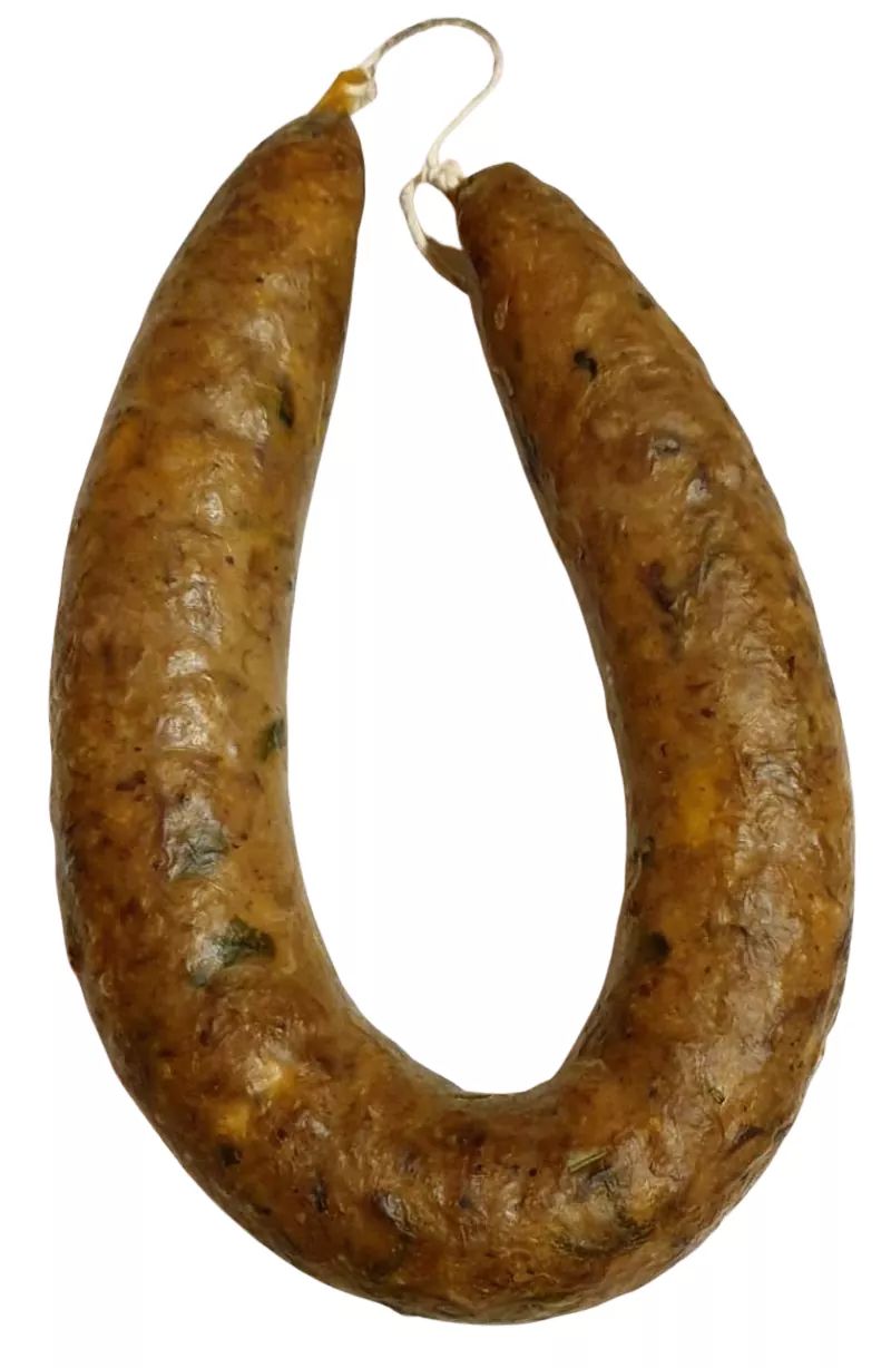 • Chouriço castanho em ferradura com textura rugosa e manchas verdes